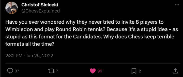 Read this previous sentence again. To me, it’s bonkers that the Candidates tournament can be determined by the effort of the last-placed player, someone with no chances at all. If they exert their full strength in the earlier stages of the tournament, they’re very unlikely to be as motivated in the later stages of the tournament. I am rooting for an exciting event and a last round full of drama, but format doesn’t ensure that.