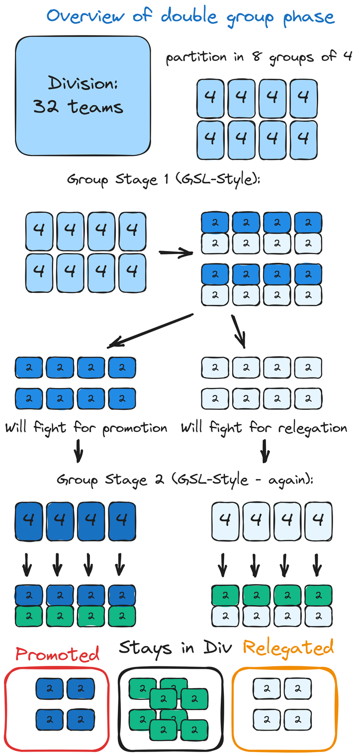 At the end of these group stages, we have 4 baskets of 8 teams: 8 promoted, 8x2 maintaining, and 8 relegated. Now starts the playoff phase for each of these groups of 8. It is a double-elimination bracket but with a single grand final.We have managed to separate the division into these three groups with every match being important and therefore great for spectators. The cost of this is minor: some teams will play only 4 matches and some will play 6 matches.