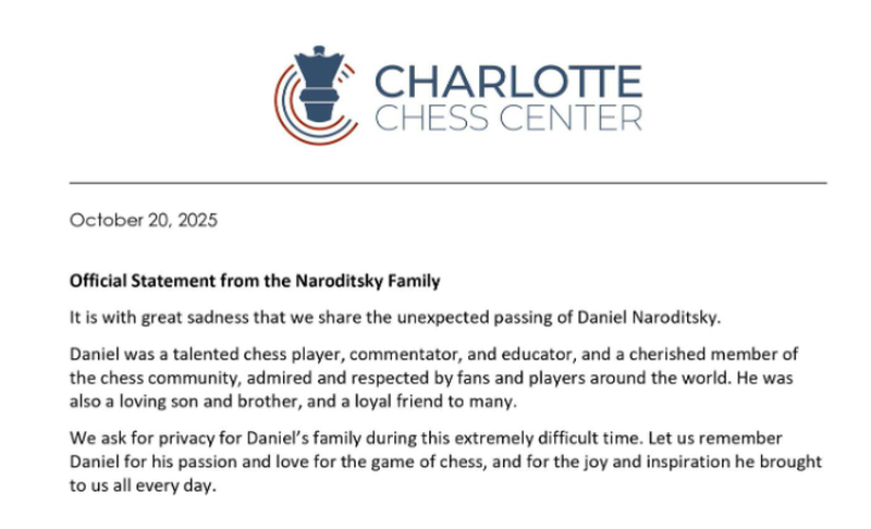 Das Charlotte Chess Center, das die traurige Nachricht veröffentlichte, bat darum, in dieser schwierigen Zeit vor allem an seine Familie zu denken. (Quelle)