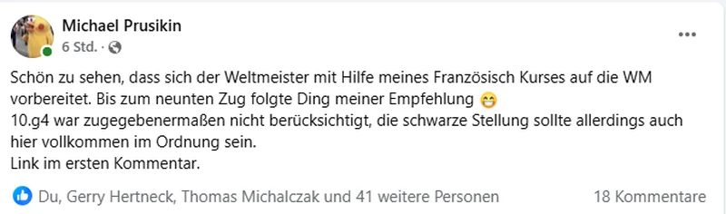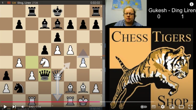 Von wegen Formkrise: Ding Liren führt bei der Schach-WM in Singapur 1:0.Am 1. Tag der Schach-Weltmeisterschaft überraschte Ding Liren mit einem Schwarzsieg gegen den favorisierten Herausforderer Gukesh. Nach der Eröffnung mit einer Variante der französischen Verteidigung stand Ding Liren leicht besser und verwertete sukzessive seinen Vorteil. Ob Gukeshs Sekunanten Rapport und Gajewski sich bei Chess-Tigers-Referent Michael Prusikin Inspiration geholt haben?
