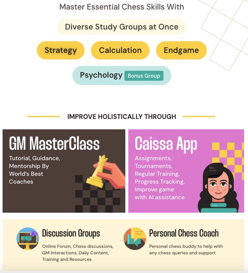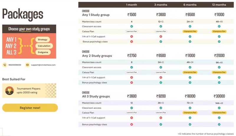 Users can select study groups based on their target skills, with packages starting at INR 1,500 per group for one month. Click here to check out the full package details. If you register for 3 or more months, you can avail of a free 2-hour Buddy call for your guidance. With a 6-month or longer subscription, you will be upgraded to the Caissa Champions plan. Learn more about Caissa's plans and details.