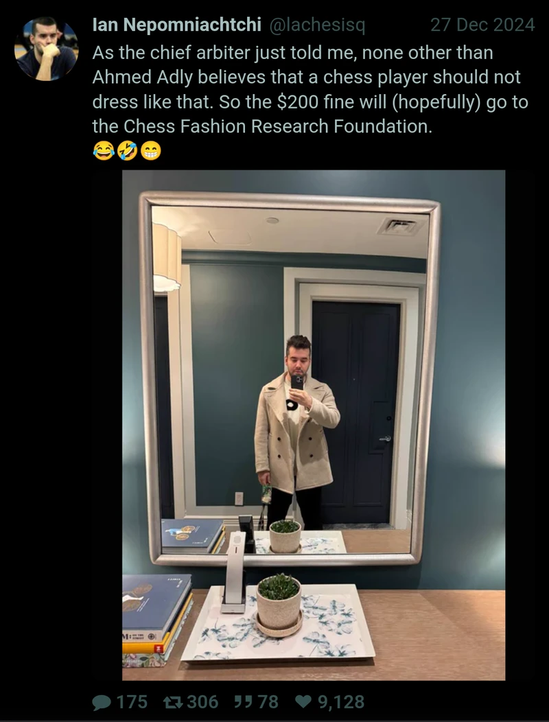 But of course Carlsen quitting and saying 'f**k you" is way over the line, considering that everyone follows same rules, for example Nepo was also fined during Rapid for his jacket.