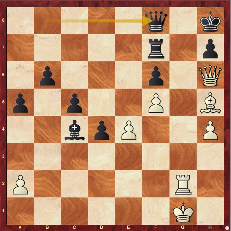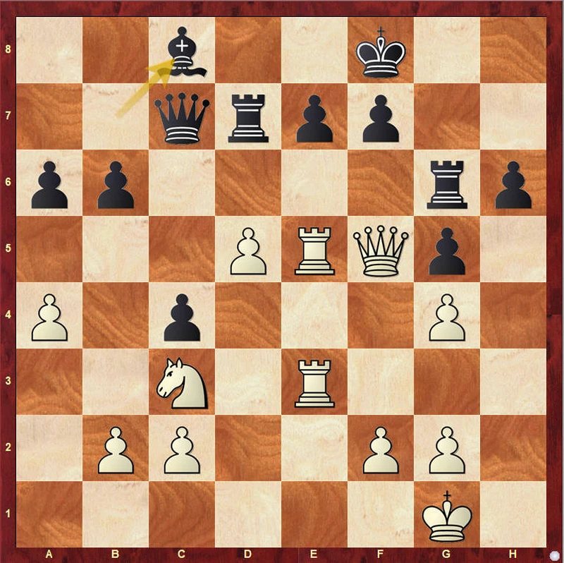 Black has just played 29. ... Bc8, threatening with 30. ... Rxd5. Which retreat square is better for the queen, e4 or f3?