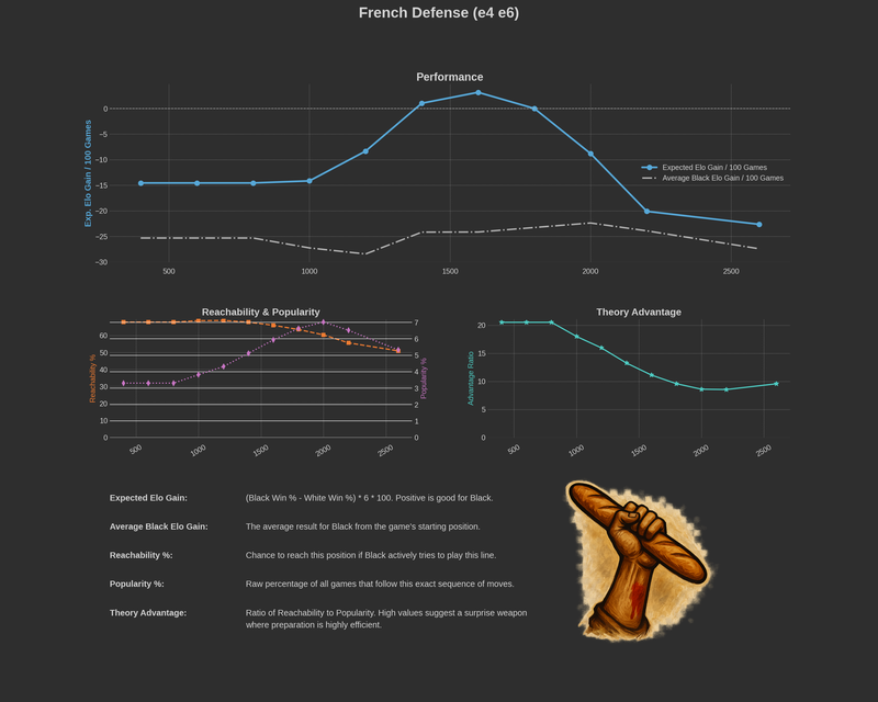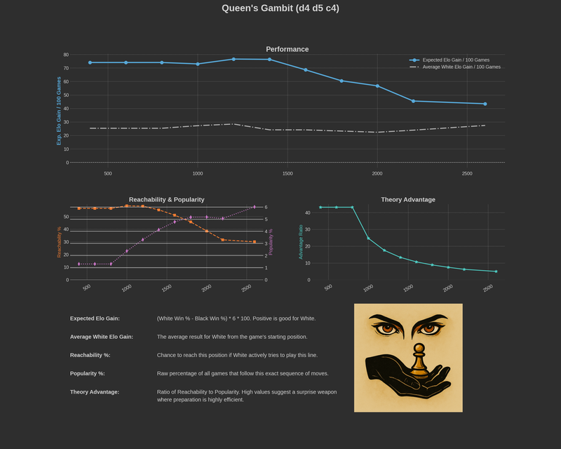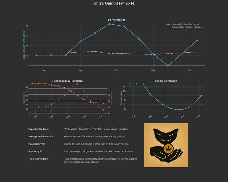 The goal is to see how an opening's stats change across different Elo ratings. The charts visualize its performance (as Expected Elo Gain / 100 Games), its reachability (how often you can steer the game into it), its overall popularity, and a "Theory Advantage" metric to quantify its surprise value.