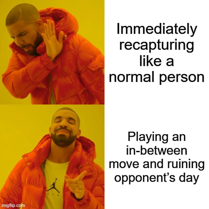 Sometimes you don’t rush to take back material right away. Instead, you slip in a move that creates an immediate threat - forcing your opponent to deal with it first. And only then you recapture on your own terms. That’s the idea behind an in-between move.This idea is crucial - miss just one in-between move, and even a grandmaster can throw away a winning position in a single moment.