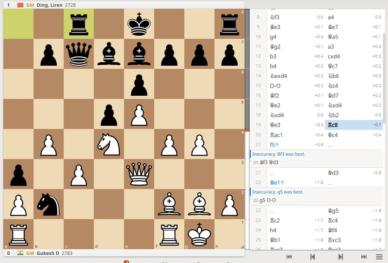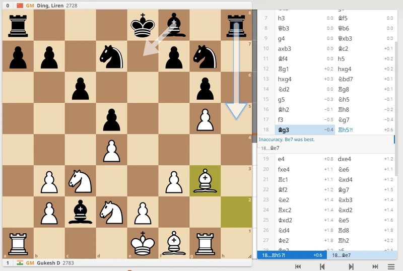 Gukesh responded with his characteristic optimism, pushing with 15.g5, a move that weakened his f5 square but created attacking chances. Ding had the opportunity to reposition his bishop to safety with Bf5-e6. Unfortunately for Ding, his clock was ticking dangerously low, and he failed to address the vulnerability of his bishop on c2.