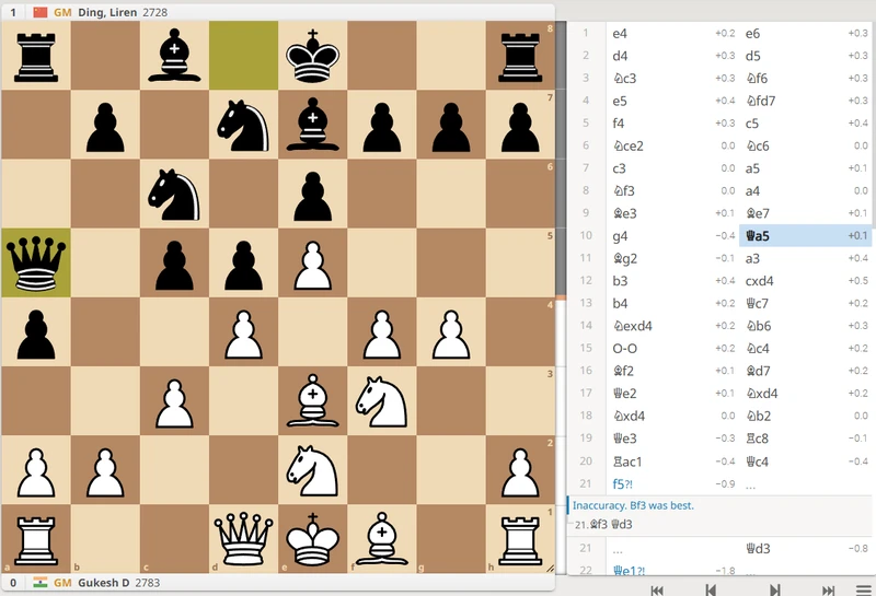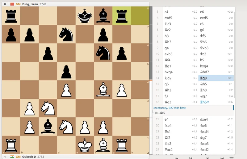 Game 3 saw a return of Ding's time management issues. Once again, he spent excessive time in the opening, despite playing into a relatively standard position. By move 10, he made a critical and committal decision with Bc2, effectively trapping his own bishop in White's camp. This was a questionable choice compared to the safer Be6, which would have kept the game balanced.