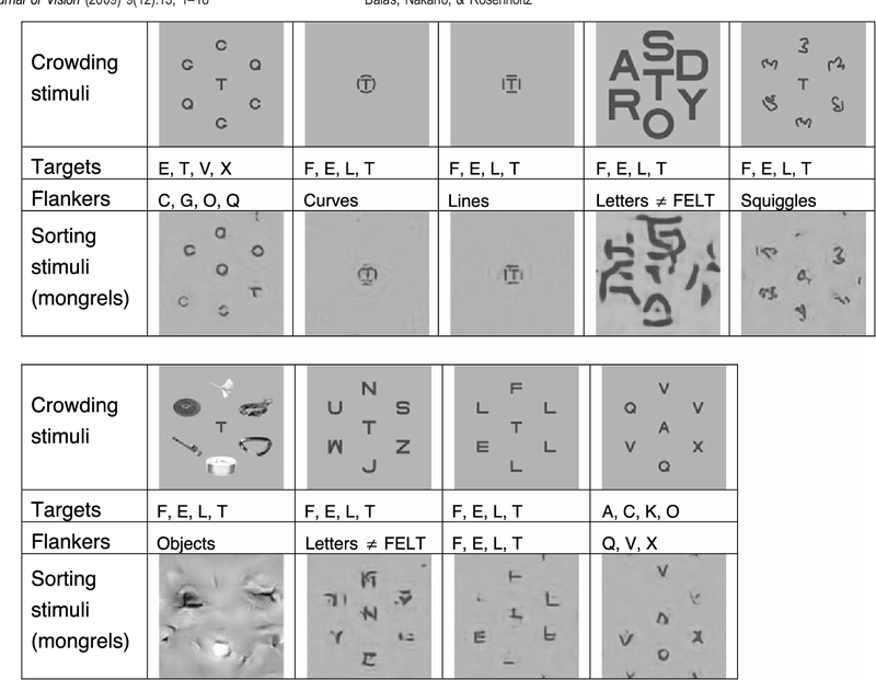 Remember, this isn't about your acuity! In fact, in some ways it's even more pernicious. Your visual system does a reasonable job of making guesses about what's really out in the world based on limited data, and by itself, blurry vision isn't so terrible to cope with. Crowding is something worse though, because it seems to involve your visual system sort of jumbling up the items that are crowded together and delivering a best guess about what was there using that mixed-up set of ingredients. My colleague Dr. Ruth Rosenholtz and I have worked with a particular model of this for several years now that allows us to make estimates of what those guesses might be, and you can see how hard to interpret they can be below.