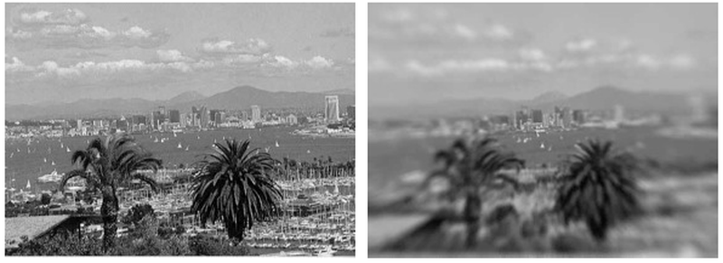 At left, a photograph of a scene - at right, the same scene rendered to approximate the acuity and contrast sensitivity limits of peripheral vision. Image Credit: Stuart Anstis