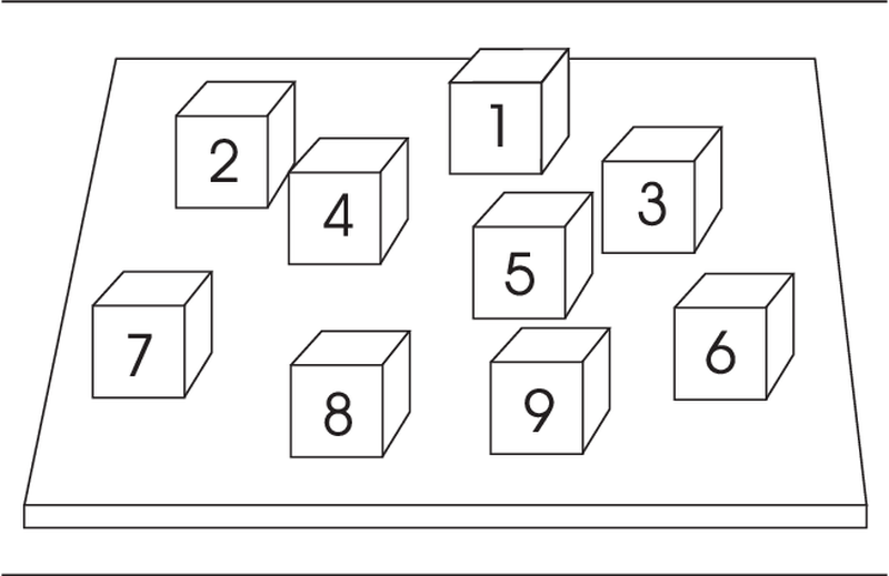 We have one of these in my department and I just love the physical apparatus for this one. This is an array of cubes set into a plastic surface in a pseudo-random arrangement (this means they are sort of jittered around rather than being lined up in neat rows and columns), each cube bearing the order in which it is to be tapped. The catch of, course, is that the person administering the test gets to see this order while they tap the blocks in front of the participant, but the participant then has to try and recreate that order without the aid of the numbers. In the "backward" version of the task, the participant is supposed to recreate the order in reverse.