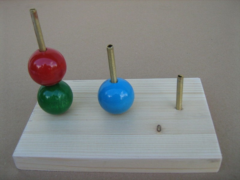 In the Tower of London (ToL) task you are still shifting objects around between three posts subject to some rules, but your goal, the objects, and the rules are a little different. First, let's talk about the goal: In the ToL, I may give you any old arrangement of the three colored balls to create from your starting position - there isn't a single outcome that you're always trying to reach. Instead, I'm interested in how you transform one arrangment into another. Second, how about those posts? The uneven height of the posts means that there is a physical constraint imposed on the moves you can make: You can't just pile up three or even two balls on any post you like! Finally, the rules are a little simpler: You still can't move an object if it has something on top of it, but you can put any object on top of another if you like.