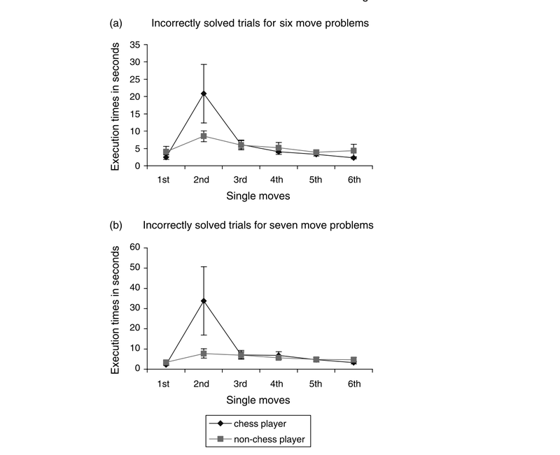 These graphs are showing you how much time participants in the two group spent on each of their moves for 6- and 7-move problems that they ultimately got wrong. What I love about this data is that I feel like it suggests something that separates these groups cognitively in terms of a specific process - error monitoring. Why is that second data point up so high in the chess player group? The authors suggest that what you're seeing is effectively an "Oh no" response: Chess players who have just made a mistake with their first move in the ToL task notice, and then they try to figure out how to regroup. By comparison the non-players just sort of sail on through, moving discs around until they find out they're out of luck. Now look, there are some important caveats here to consider. Those error bars on that 2nd data point are awfully large, which means there is a lot of variability across individuals in that data. In turn, this implies that a subset of players in the group is pushing that up rather high - are they more highly rated players? Could be, could very well be, but that isn't in the paper so I can't tell you one way or the other. The other thing to think about is whether this is actually a difference in cognitive processing or a difference in motivation: Maybe chess players are more likely to dig in and try to solve a problem they've encountered? Still, even with these grains of salt that you should take this figure with, I really like how clearly this design indicates some specific differences in cognitive performance that aren't just evident on the chessboard.