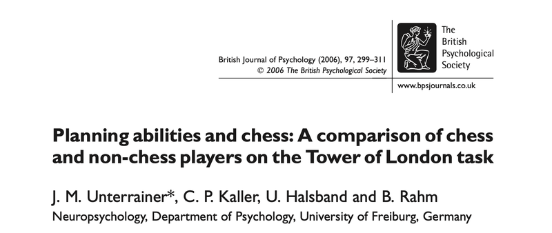 Unterrainer, J. M., Kaller, C. P., Halsband, U., & Rahm, B. (2006). Planning abilities and chess: a comparison of chess and non-chess players on the Tower of London task. British journal of psychology (London, England : 1953), 97(Pt 3), 299–311. https://doi.org/10.1348/000712605X71407