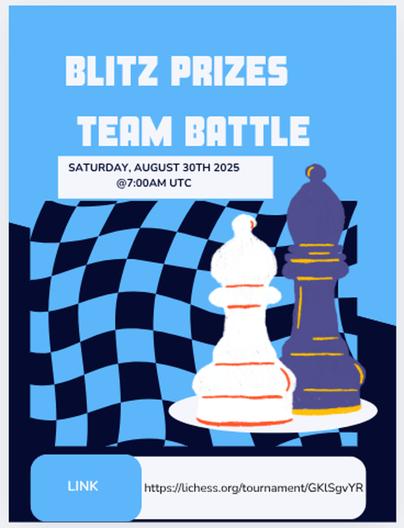 Join for cool prizes!The Blitz Prizes Team Battle is coming up! Join for some cool custom made logos for just you or your team! The link is https://lichess.org/tournament/GKlSgvYR! See the flyer for more information! Sponsored by https://lichess.org/team/imagine-dragons-onerepublic!