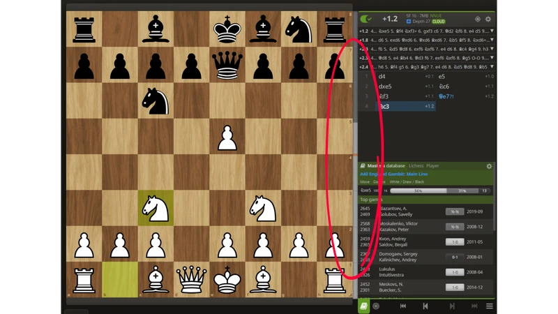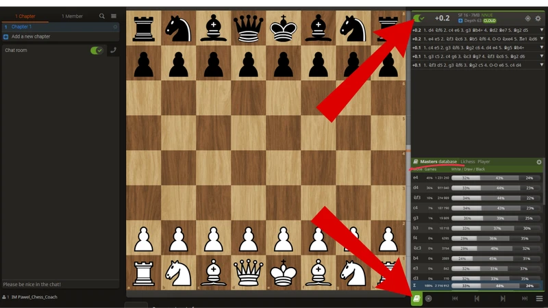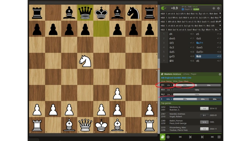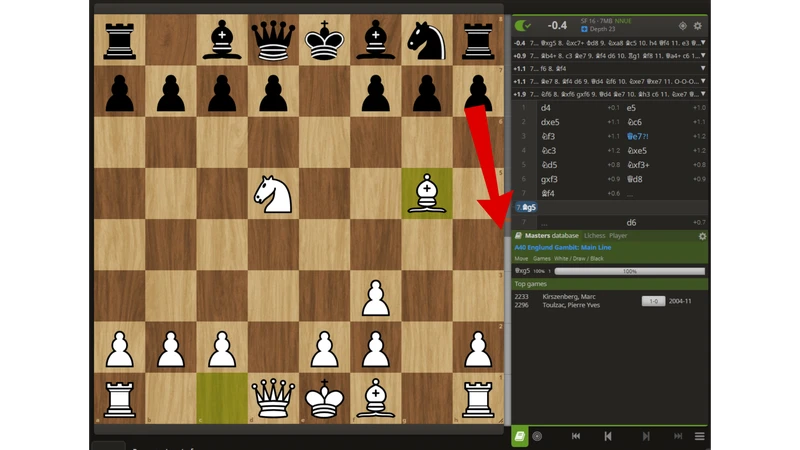 Now, turn on “Analysis” which will bring up the evaluation bar, and then go to “Opening Explorer & Tablebase”. Here, we can see master games and learn how top players handled the same opening. This is a great way to study the best patterns of play!