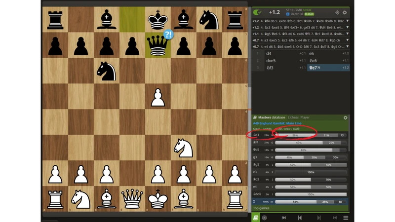After analyzing a few more moves, we reach the position shown in the image below. The most popular move is Bf4, which has a 50% win rate (2 games). However, we can also see that the move Bg5 below has led to a 100% win rate for White (1 game). This could be an interesting idea.