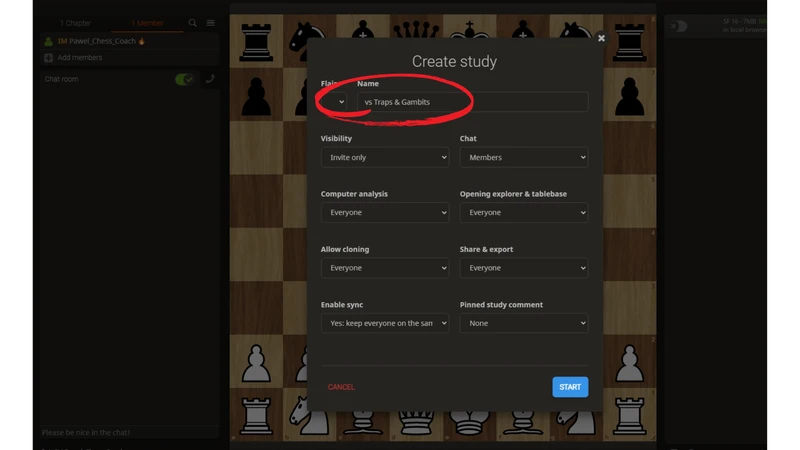 Then click “Create New Study” and give it a name, such as “vs Traps & Gambits” or something that feels intuitive to you.