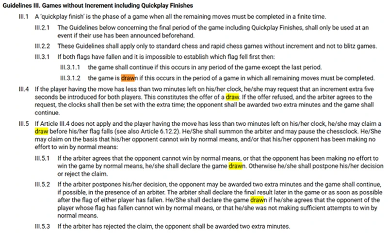 Bij quickplay finishes (partijen waarbij er geen increment is, bv een 5+0 blitz of in een 90’+30’ officiële partij), kan je dus tijd bijvragen als je minder dan twee minuten hebt. En die extra tijd is enkel mogelijk onder de vorm 5” per zet, dus de quickplay-partij wordt een increment partij (!). De vraag stellen betekent meteen ook een remisevoorstel. Als de tegenstander dit weigert, dan wordt de vraag aanvaard en krijgt de tegenstander nog eens twee minuten extra.