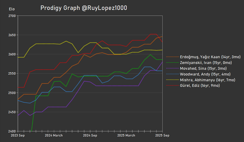 I have selected six players who could be part of the next generation. These players are on the FIDE Top Juniors September 2025 list, and are under the age of 17. They are the most promising candidates for the next generation due to their age and strength. Other players in the top juniors list are either older, or not rated high enough.