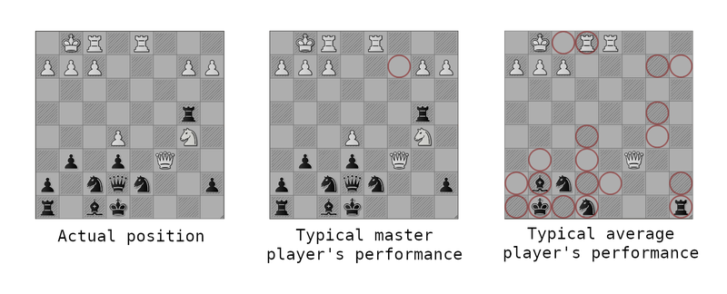 Hearst (1972) had chess players reconstruct positions after only looking at them for 5 seconds. Errors are shown in red.