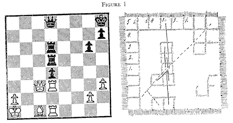 A drawing done by one of the chess experts in Binet's study. The drawing shows the nature of representation of a chess position in the mind of a blindfold player. It is not a concrete image but a schematic understanding of the force of the pieces. From Thought and Choice in Chess (de Groot, p. 4).