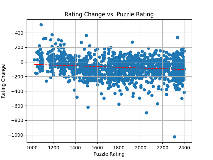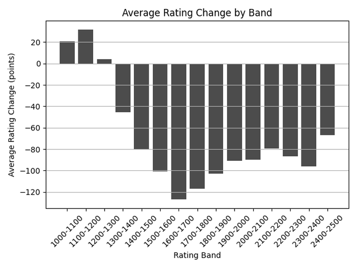 This shows us that the lower rating bands actually saw a slight increase, while the largest drops were concentrated around the 1500-1600 rating range. So if you in December 2021 had a 1550 puzzle rating and did not do anything until today we could expect that you would drop your puzzle rating to around 1425.