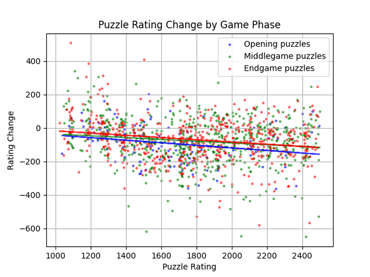 Again there is a tendency that shows that the puzzles have dropped more points the longer we move up in puzzle rating. I then thought about whether the game state of the puzzle had an effect on the drop, so I subdivided the puzzles into opening, middlegame, and endgame puzzles.