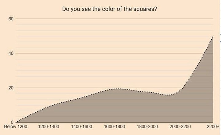 This diagram shows that seeing the colors of the squares (or maybe knowing) is an attribute of the +2200 rated group, where half can do it without applying logic. All of the groups below 1200 had to use logic to find the colors of the squares in puzzle position number two.