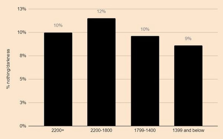 For the 1200-1400 rated group, only 38% managed to solve the puzzle. If we then move up to 1400-1600 then 70% got it correct. I haven’t created a diagram for how long it took to solve since it is based on the participant’s own experience. However, there was a clear tendency that of those who solved it in the lower rating groups many had to use +4 minutes to do so, while all but two of the +2200 group used more than 60 seconds.