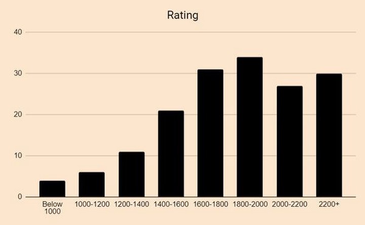 And here is the distribution by rating with an even distribution at the higher rating groups. Blindfold chess might scare some beginners off. The rating is based on the Lichess blitz rating (chess.com users were asked to add +200 rating points to that rating).