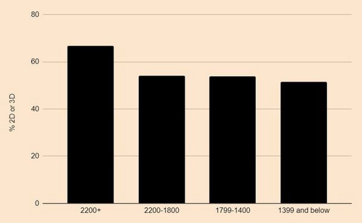 The results indicate that there is an even distribution across ratings of players who can’t create a visual image of the board from the starting position. If we look at the group that either sees a 2D or 3D board it looks like this.
