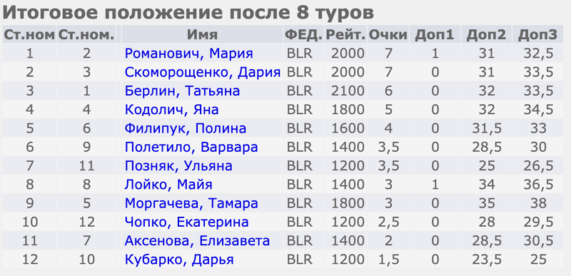 В финальном турнире на победу претендовали Романович, Скоморщенко и Берлин. Победила Маша Романович. Вторая стала Дария Скоморощенко. У них одинаковое количество очков, но личная встреча в 4-ом туре предопределила исход.
