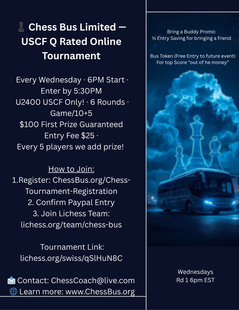 The Chess Bus Limited continues to roll out exciting Chess !Chess Bus Limited – $100 GTD Weekly Recap