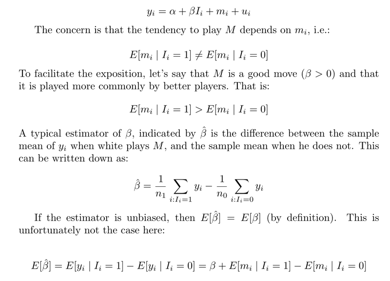 Assume that y is the result of the game, coded numerically (win as 1, draw as 0.5, and loss as 0). y depends on whether move M is played, indicated by the index variable I (I=1 if M is played, I=0 otherwise). It also depends on the difference in playing ability between the two players *after* M is played, which I will call m. So, I will think of m as capturing the difference in playing ability in the later stages of the game, the middlegame and the endgame. I will model y as follows, where α, and β are constants, u is a mean-zero error term, independent of the I and m variables, and i is the subscript indicating the game (note I have not included a coefficient for m, since it is not measured in any way, it’s an unobservable variable with arbitrary units):