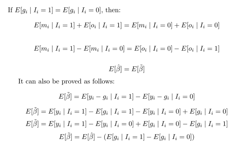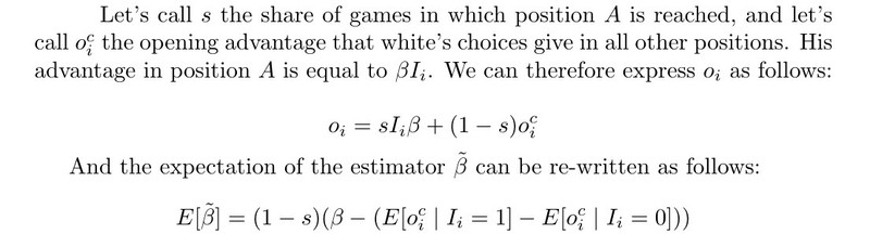 We see here that the adjusted estimator is also biased, if the difference in playing ability in the opening is related to the choice of playing M in position A. There are two reasons why o is not independent with respect to I. The first and direct reason is that playing move M is by itself an opening choice that raises (lowers) o, if β is positive (negative). The second and indirect reason is that people who play the good move M are more likely to also play other good moves in other opening positions in other games. Think of them as the chess players who read theory.