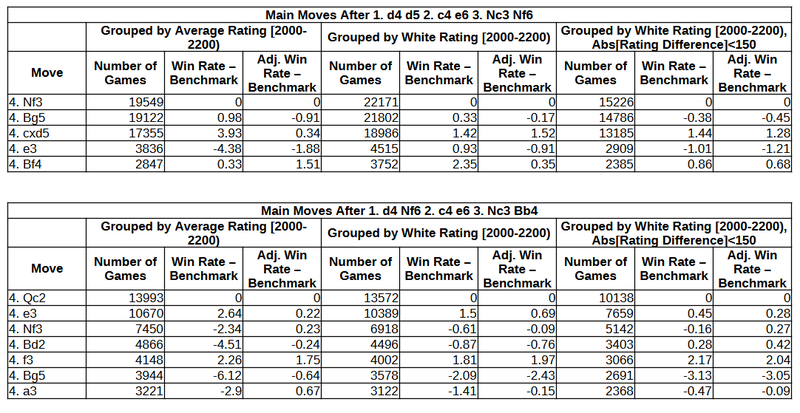 I present the raw and adjusted win rates as their difference from the benchmark (the rates corresponding to the most common move, 4. Nf3 and 4. Qc2 respectively).