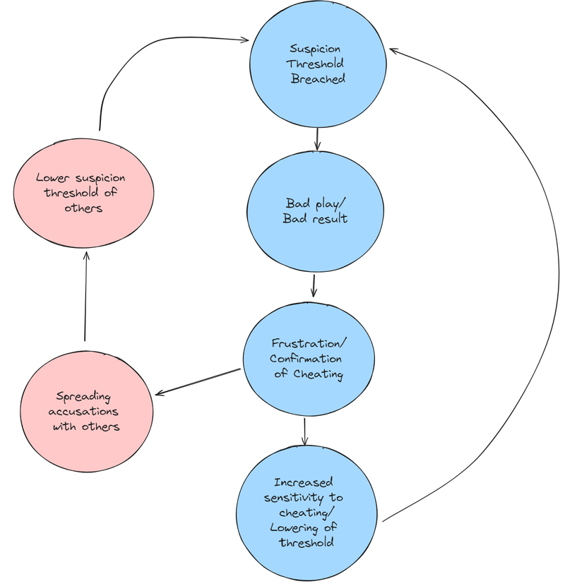 However, I don’t just call this a virus because of its negative effects on the 'host,' so to speak. Rather, this infection also has the propensity to spread. This is because once the player believes their opponent is a cheater, they wish to spread this message to others. By doing so, they make others more sensitive to the possibility of cheaters, thereby lowering their suspicion thresholds. This is especially effective if the person spreading the virus does so via social media, where they have hundreds of thousands to even millions of collective followers (cough cough).