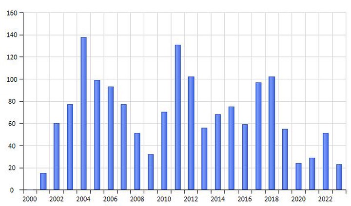 (How many classical games I’ve played each year since recording them from age 10. Graph generated in ChessBase 17)