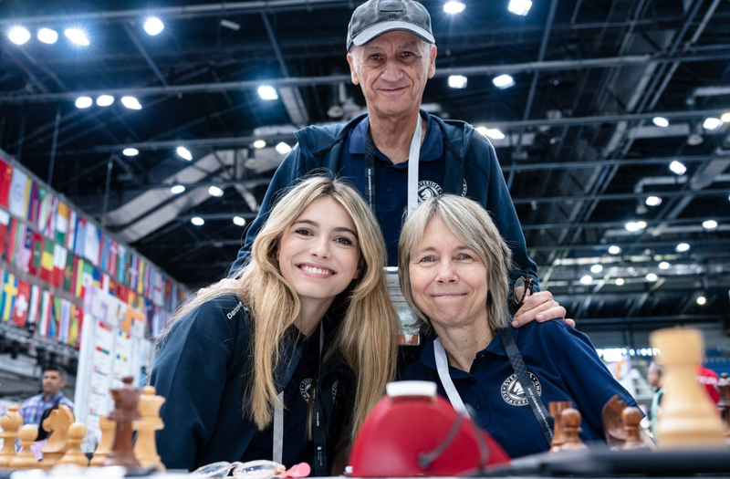 From left to right: WFM Anna Cramling, GM Juan Manuel Bellón López, GM Pia Cramling (picture from the Chess Olympiad 2024 in Budapest by Maria Emelianova)