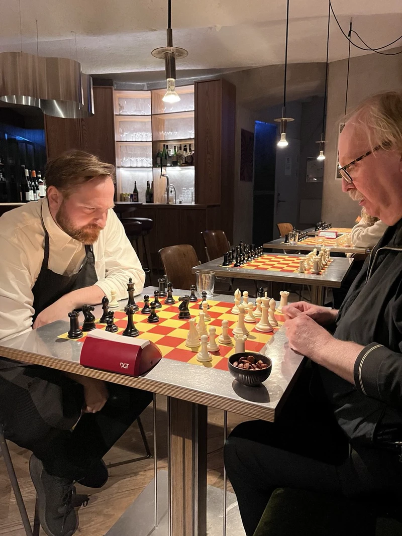 The Svarta Hästen founder Joel Ighe together with co-founder and sommelier Calle Stuborn (Calle pictured on the left, playing against Jonas Sandbom, Chief of Staff of the Stockholm Chess Federation), a wine expert and former junior champion of the Täby Chess Club. The first-class wine list reflects selections from Calle’s life. After becoming a sommelier, an acquaintance gave him the idea of combining his knowledge of wine and chess.