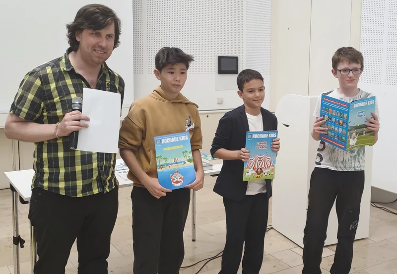 Youth winners with Rochade Kids - chess magazines as non-cash prizes, from left to right: Philipp Scheffknecht, Leo Radnaev, Filip Jevremovic, Florentin Stickler