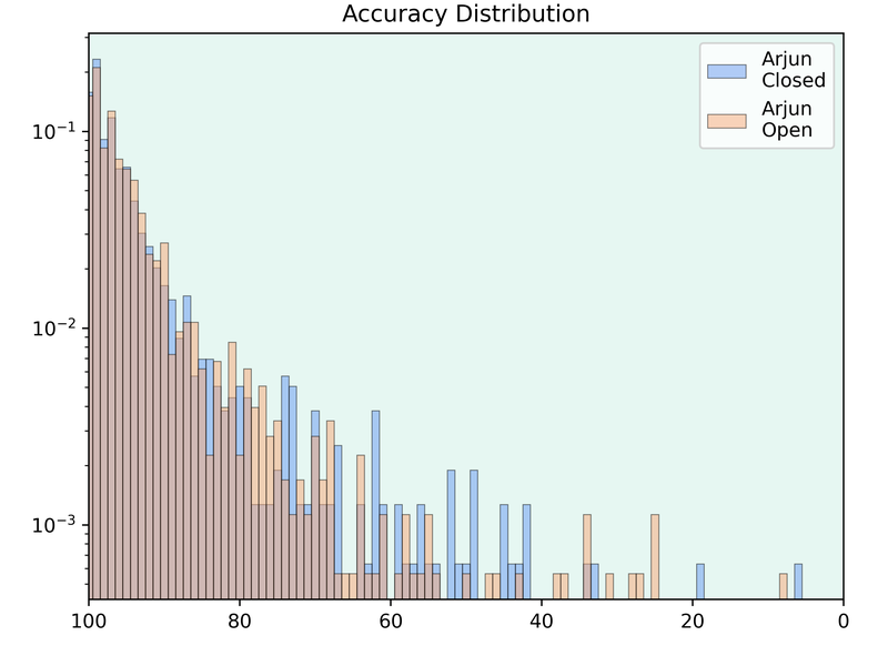 In order to look at the quality of play, I generated the accuracy distribution for Arjun’s open and closed tournaments.