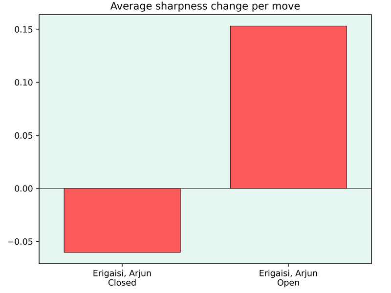 The sharpness change per move is significantly higher in open tournaments, which would indicate that Arjun is trying to steer his games in open tournaments towards sharper positions in order to be able to play for a win.