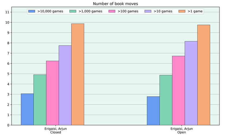 There aren’t big differences between the number of book moves per game in open and closed tournaments. The biggest difference is that in open tournaments, Arjun had more moves where there are less than 1,000 games in the database and less moves with 1,000-10,000 games in the database.