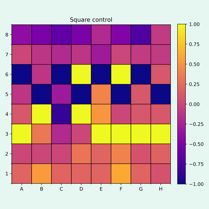 To quantify the control over a square, I want to assign a value ranging from -1 (total control for Black) to 1 (total control for White) to each square on the board. This turned out to be one of these problems that became harder and harder as I was thinking about it.