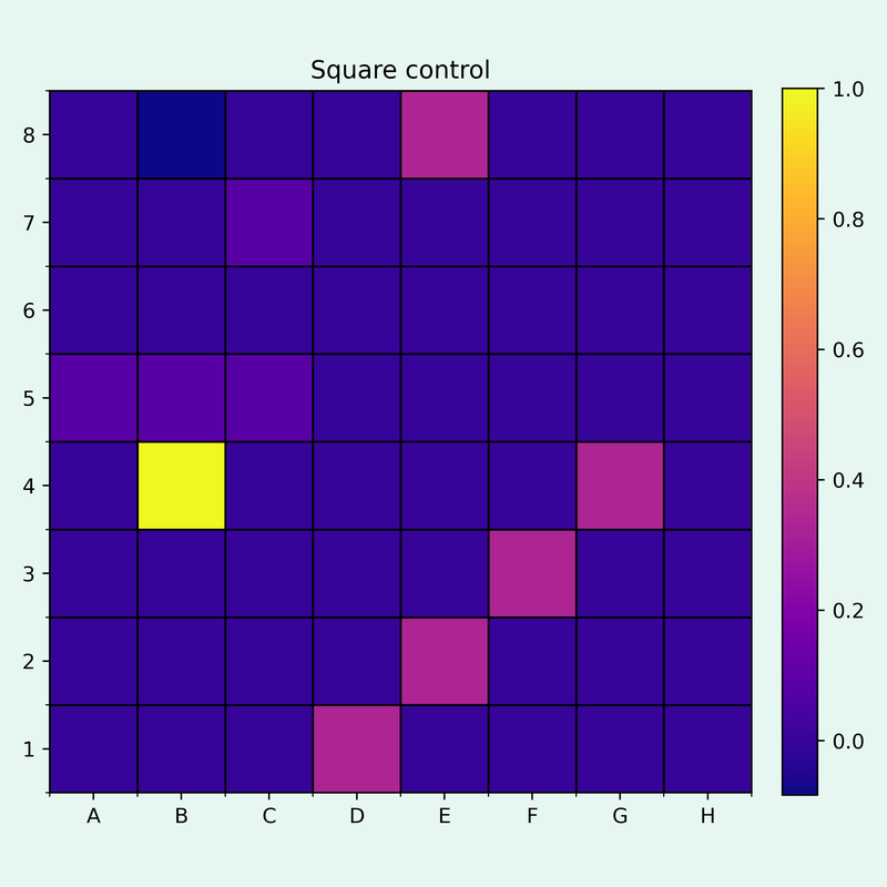 What goes into controlling squares on the board?Before starting with this project, I wanted to look into ways to quantify the piece coordination in a position. But as I started to think about that, I realised that an important part of piece coordination is how well they control the squares on the board. But it wasn't at all clear to me how to evaluate that. So I decided to focus on this problem first and work on piece coordination at some later time.