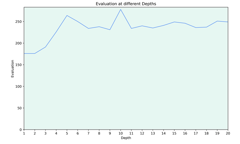 White is clearly much better, but not because of tactical reasons. So my hope was that White's advantage will be seen at low and high depths. Here is how the evaluation changes with the depth for this position: