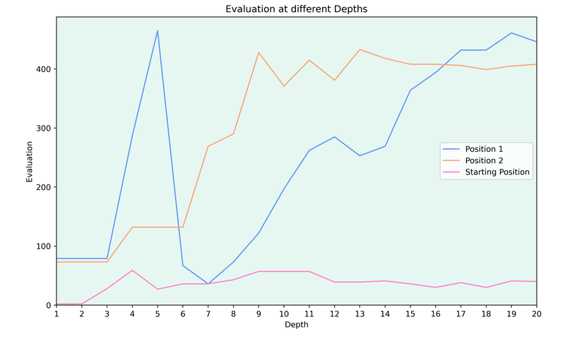 Both positions from above (in blue and orange) start off with a relatively low evaluation and the evaluation rises as the depth of the engine increases. To have a comparison, I added the evaluation of the starting position and since there aren’t any tactics in the position, the evaluation stays roughly constant.