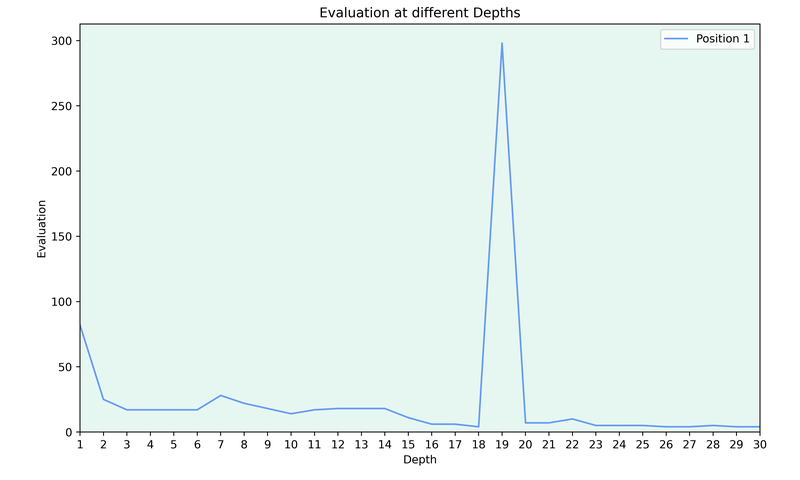 As mentioned earlier, there also seem to be some evaluation spikes at different depths. One example I noticed was the following position:
