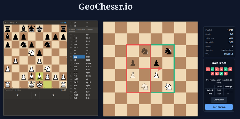 But to keep my game fresh, I need a constant supply of games. Using the lichess API , I grab the newest lichess games from tournaments played that day each night, to automatically create a new daily run. Now after I attempt to solve GeoChessr puzzle, especially when I fail, it is always the most fun to explore how the players got their pieces into this position I did not expect. Normally, to make this possible on geochessr.io, I would have to write a whole chess game engine for that. However, thanks to lichess embedded games , I can just show the user the game from lichess directly on my website, initialized to the move where to position of the puzzle appeared.
